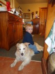 We have got Greg’s 1 1/2 yr old Grandson Micheal staying with us at the moment. He loves the dogs & they well…umm.. sometimes its mutual but most of the time they prefer to keep out of his way….At 1 1/2 he is pretty full on & we have to curb his enthusiasm at times!! Riley loves him & will often clean bowl him with his love!!! Tyler is also incredibly patient & doesn’t even seem to mind him sitting on her.. Hoons went to hide in a cage but right in after him was Michael.. It did look very cute!!! Poor old Hoons.