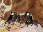 Well the kids have arrived 7/04/14 8pups-5 choc, 3 black. Sunday we had lots of nesting & restlessness & I did expect them that night. However having spent the night up & down & waiting by Monday morning she was pretty relaxed again..Great!! So after a relaxing day with just short outings the first contraction came about 5pm.. on the bed!! but we did manage to get into the whelping box for the first arrival.