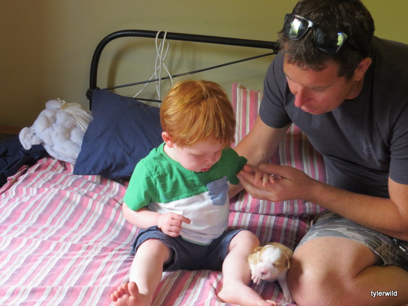 Caden checking out his puppy