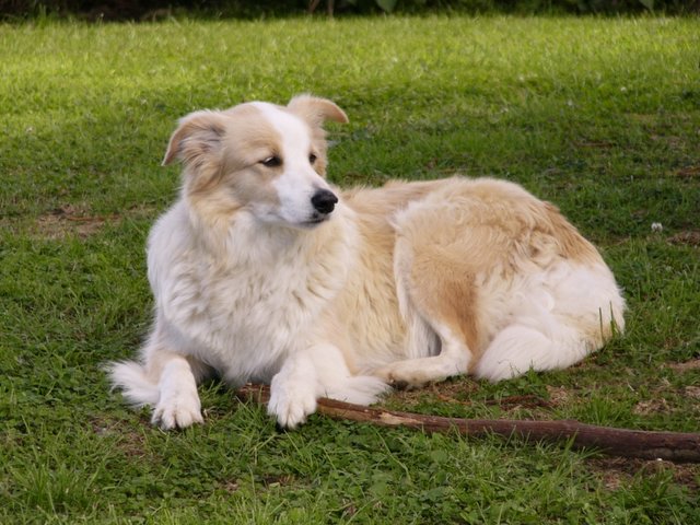 Quite tall for a girl. Her coat is like silk & a beautiful colour. She is hugely confident & a really happy dog, except very shy of guns & thunder!! She can be quite persistent for attention & whack you if you stop the patting. She lies upside down & expects me to rub her tummy all day.. well till she hears something exciting. A trait she has passed on to many of her pups.!!!